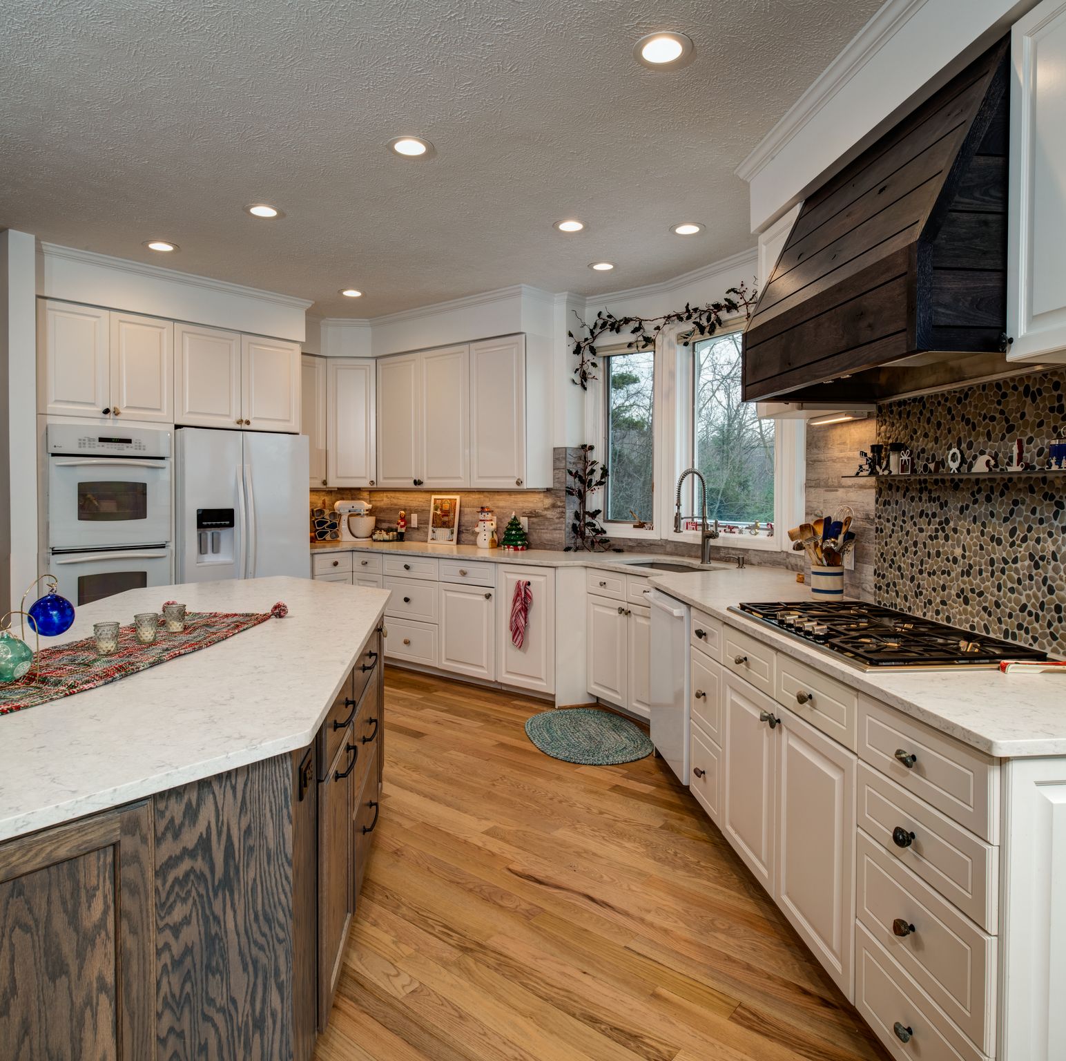 Throughout their new space, organic and earthy elements bring warmth and a one-of-a-kind look. The pebbled backsplash behind the stovetop ties in perfectly with stone drawer pulls – each one a different shape and color.